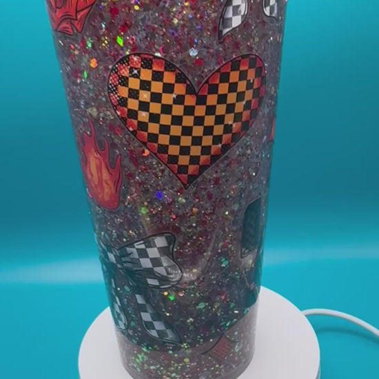 This is a 24 ounce acrylic snow globe tumbler. Comes with lid and straw. Handwash only.
