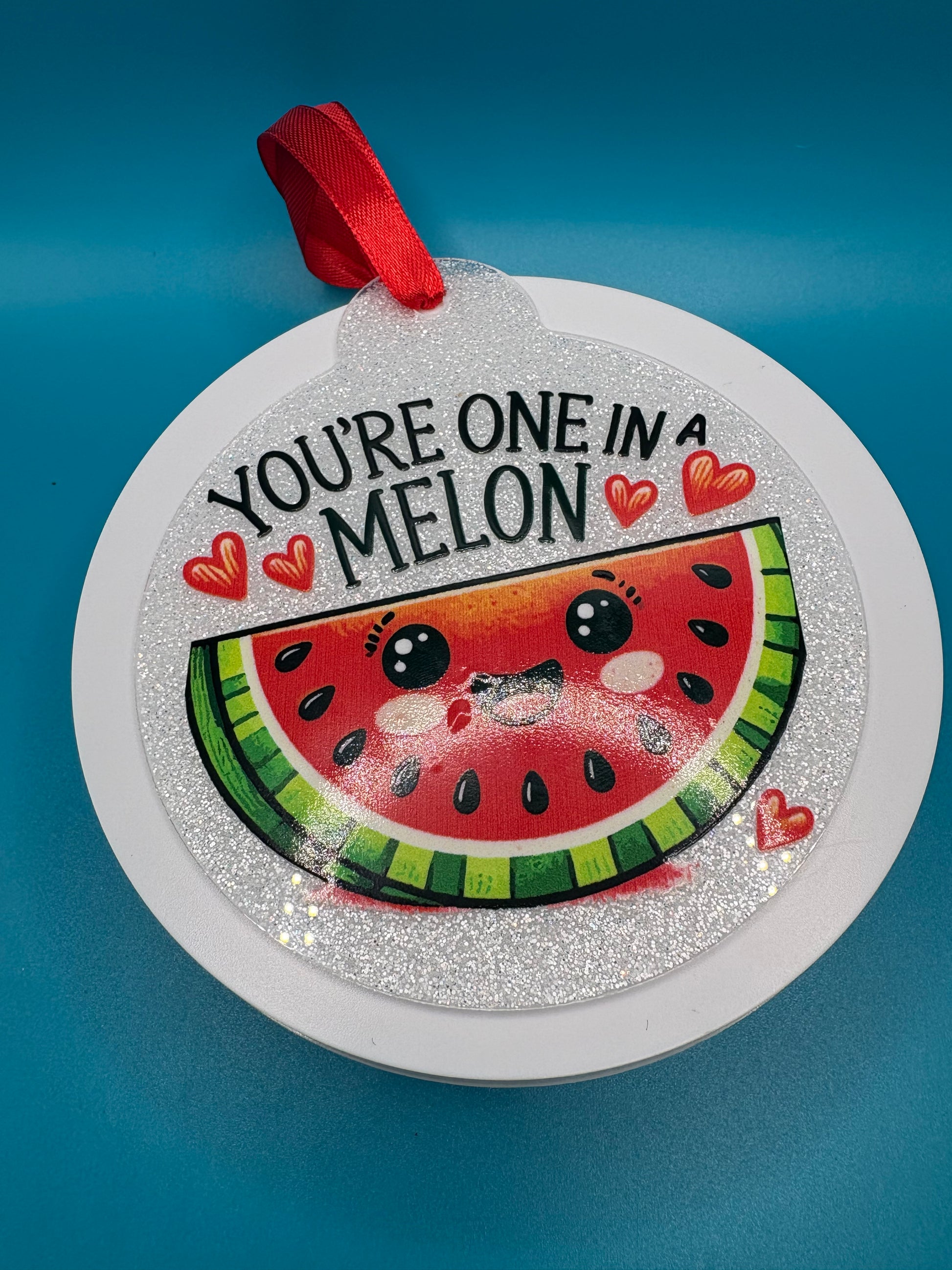 4 inch flat acrylic ornament has a sparkly background with red ribbon. This ornament has a Very cute watermelon design.
